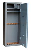 Сейф односекционный, на 8 стволов оснащен полкой и отделением под патроны. Ложементы — дерево.