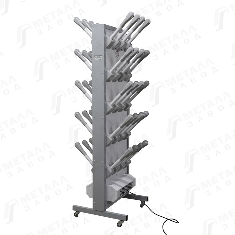 Размер (ВхШхГ): 2061 × 625 × 656* мм Вес товара: 63* кг Упаковка Поставка в разобранном виде, упаковка - 5 мест: • место 1 из 5 (корпус) 1847х660х140, брутто 26,4 кг; • место 2 из 5 (силовой блок) 560х370х245 мм, брутто 10,8 кг; • место 3 из 5 (подставка под модуль) 125х175х612 мм, брутто 4,6 кг • место 4 из 5 (комплект съемных патрубков) 512х425х335 мм, брутто 12,3 кг • место 5 из 5 (комплект съемных патрубков) 512х425х335 мм, брутто 12,3 кг Модули сушильные для обуви моделей Союз-20 предназначены для сушки мокрой обуви, предварительный отжим не требуется. Модули сушильные для обуви представляют собой металлический корпус, установленный на сборную подставку с поворотными колесами . В модулях сушки обувь размещается вне корпуса, путем навешивания на съемные патрубки. В моделях Союз-20 съемные патрубки расположены с обеих сторон корпуса. В нижней части корпуса модулей для сушки обуви встроен блок нагрева, нагнетающий теплый воздух внутрь корпуса, который затем выходит через отверстия в съемных патрубках. Блок нагрева состоит из двух тангенциальных вентиляторов, соответственно двух игольчатых слюдяных нагревателей, датчика контроля температуры и электронного блока управления. Кнопки управления и световая индикация режимов работы расположены на боковой стенке корпуса. В качестве защиты от перегрева используются термоплавкие предохранители (без возврата в исходное положение). В верхней части корпуса встроена бактерицидная лампа ультрафиолетового излучения, которая обеззараживает проходящий через обувь воздух ТЕХНИЧЕСКИЕ ХАРАКТЕРИСТИКИ Габаритные размеры (высота, ширина, глубина) 2061×625×656*мм Количество съемных патрубков для завешивания обуви 40 шт. Максимальная нагрузка на съемный патрубок для завешивания обуви 3 кг Длина шнура электропитания 2,5 м Заземление шкафа через заземляющую жилу и заземляющий контакт в вилке шнура электропитания. Напряжение питания 230В/50Гц Количество тангенциальных вентиляторов 2 шт. Производительность тангенциального вентилятора 600 м3/час Мощность электродвигателя тангенциального вентилятора 106 Вт Количество игольчатых слюдяных нагревателей 2 шт. Мощность игольчатых слюдяных нагревателей 2х1000=2000 Вт Тип бактерицидной лампы Philips TUV 8W Мощность бактерицидной лампы 8 Вт Режимы работы · сушка без нагрева; · точное поддержание температуры 400; · режим охлаждения нагревательного элемента в течении 1 минуты при отключении Таймер с фиксированной установкой автоматического отключения · автоматическое отключение от 30 мин. до 8 часов, с шагом 30 мин.; · ручное выключение (без таймера) Защита от перегрева термоплавкий предохранитель (без возврата в исходное положение) Масса нетто 63* кг